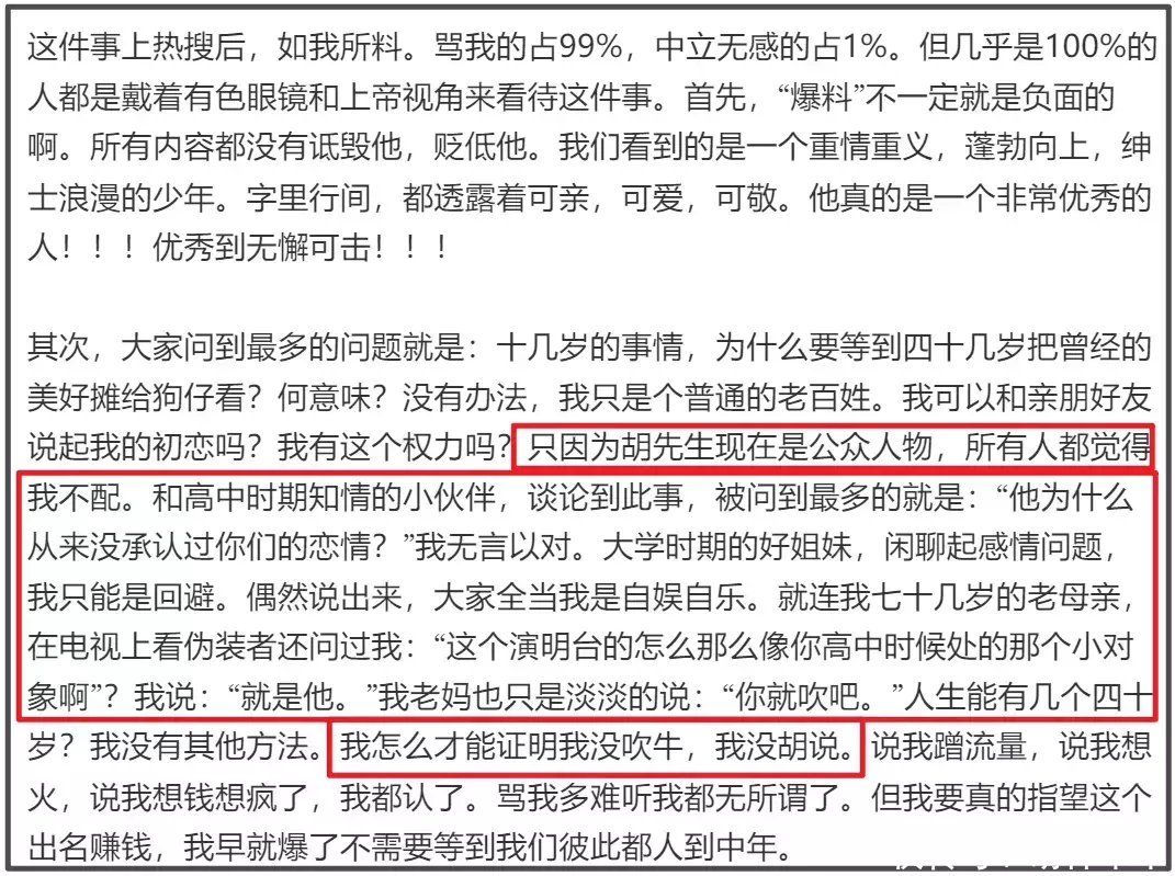 胡歌初恋回应曝光书信缘由,想向亲友自证没吹牛,否认用爆料赚钱