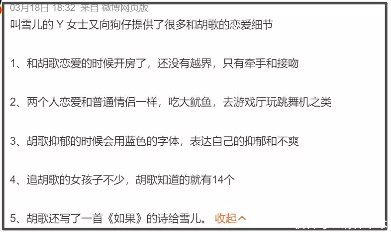早期的胡歌在节目上确实自曝过恋情,当时的主持人问胡歌以前的女友最喜欢他唱哪首歌,胡歌说“那时候还没有唱歌”,后来又问为什么分手,胡歌爆料女方出国了,就分了。这两点和Y女士爆料的两人多以书信联系、出国后分手都对上了。