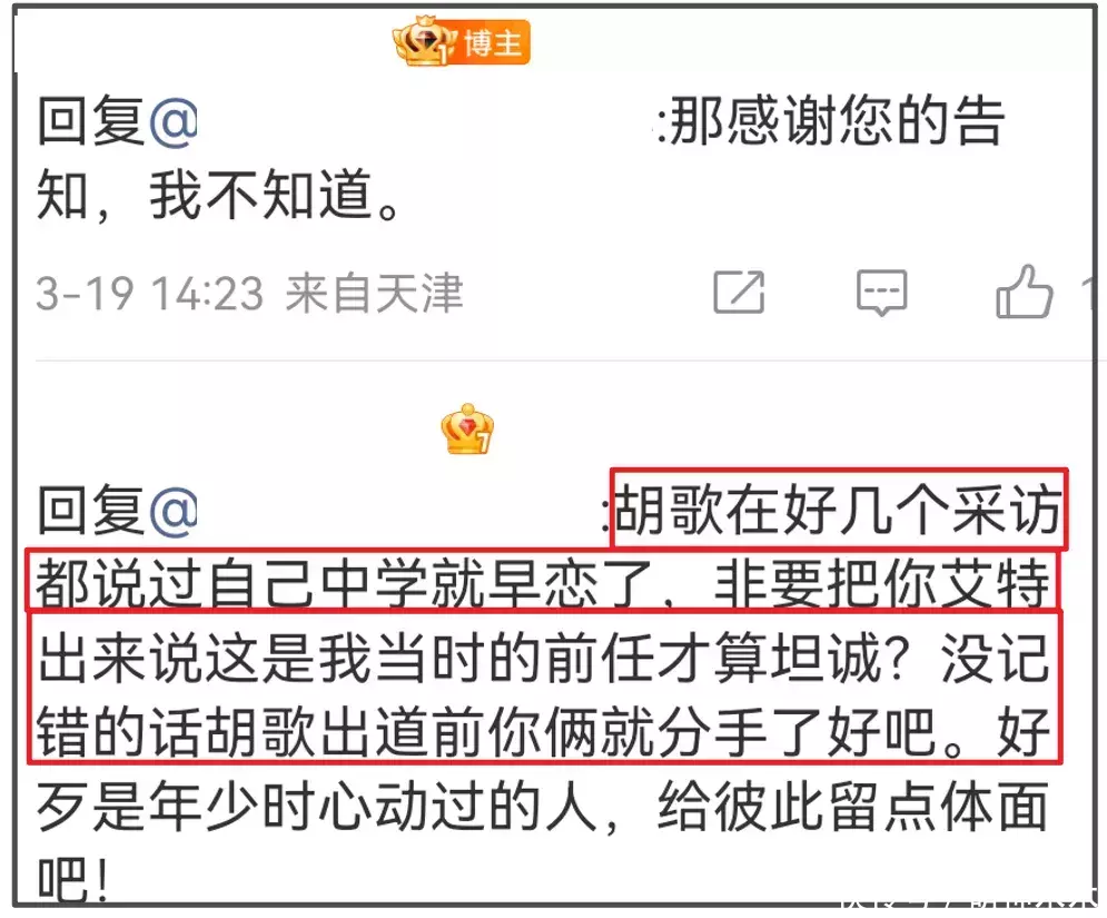 粉丝称胡歌在多个采访里提到自己中学早恋,Y女士称自己不知道,感谢告知。随后胡歌早年在节目上的发言也被扒出来了。