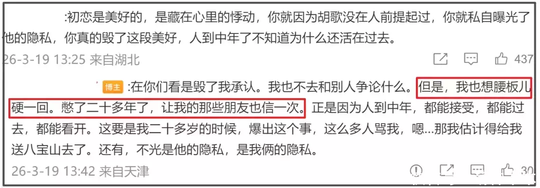 还说如果指着爆料出名赚钱,那她早就说了,不需要等到彼此都人到中年。最后还有点指责胡歌,怪他从没提起过这段感情,结尾还喊话妈妈,“这次你信了吧?我真没胡说八道。以后少看点《伪装者》”,对胡歌似乎有所不满。